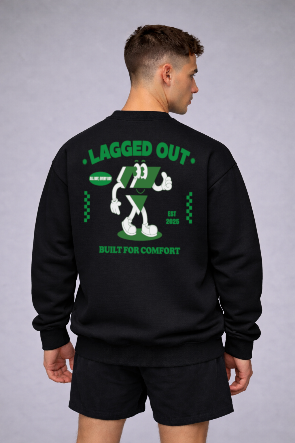 Laggy Approved Sweatshirt – Obsidian black base paired with the green Laggy mascot graphic.