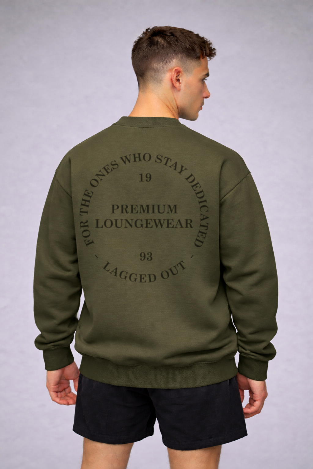 Stay Dedicated Sweatshirt – Grove (Green) base paired with black circular stay dedicated text graphic.